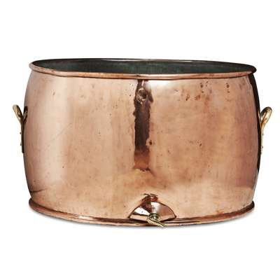 of slightly swollen form with a rolled rim and foot, tin lined interior with brass side handles and tap