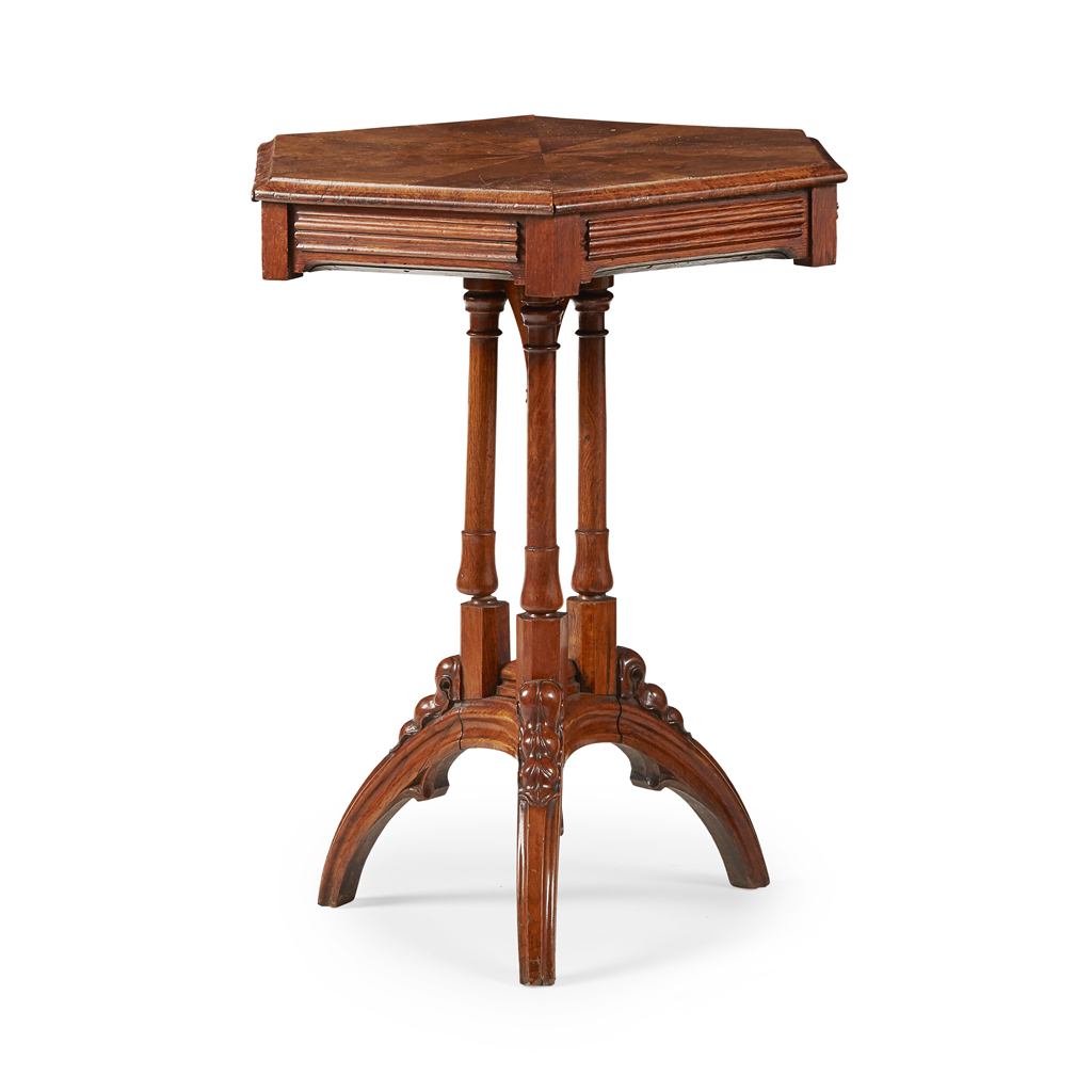 the hexagonal top with radiating veneers and moulded edge above a reeded panel frieze with two short drawers, raised on triple column supports and arched legs carved at the knees with stylised leaves