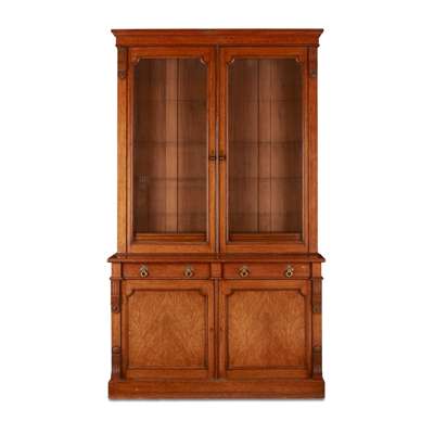 the moulded cornice above a pair of glazed doors opening to adjustable shelves; the lower part with two short frieze drawers over a pair of moulded panel doors, on a plinth base