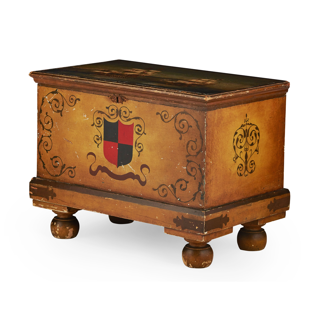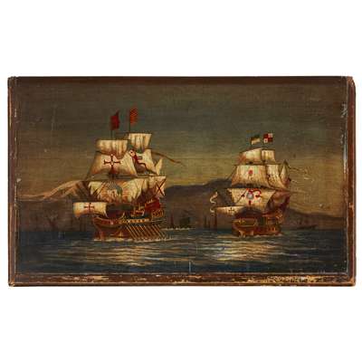 the hinged cover with a painted canvas panel depicting a galley and a man-of-war, above ochre painted sides, on turned bun feet