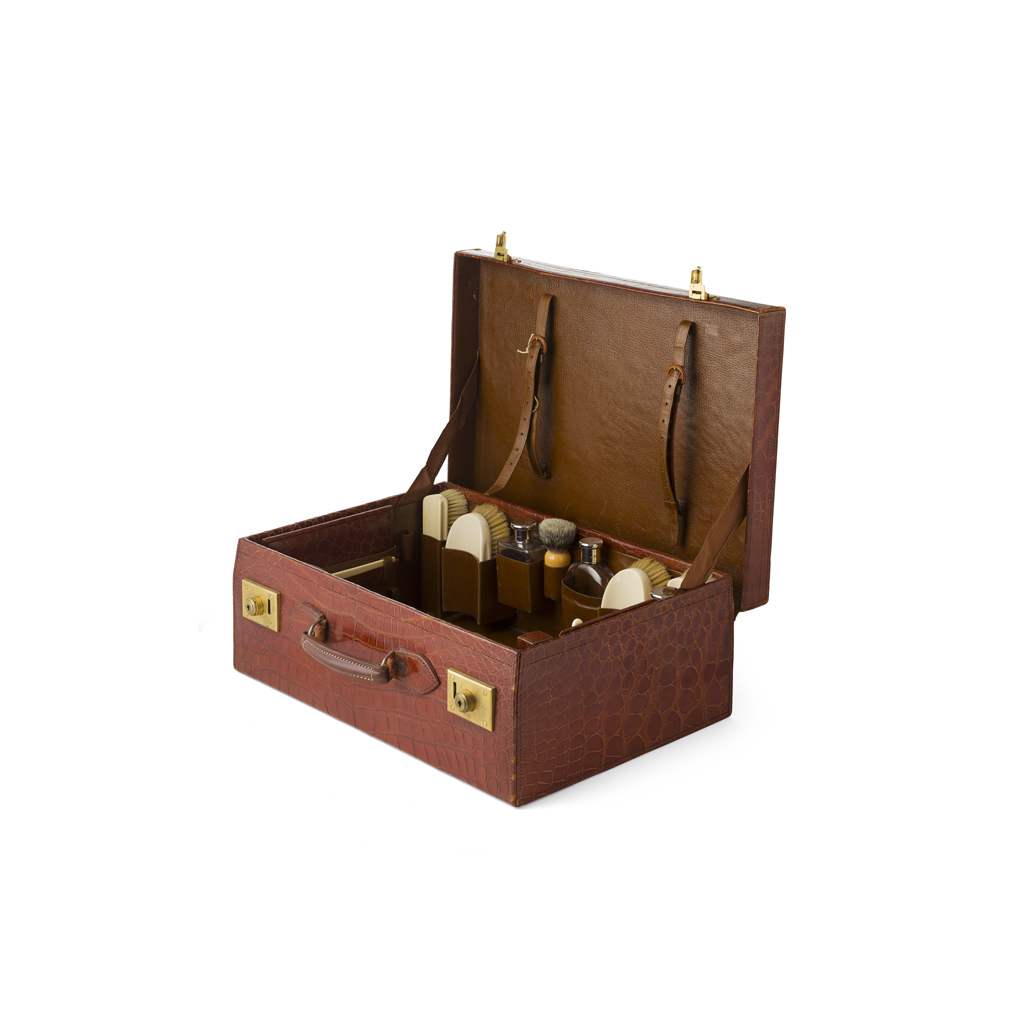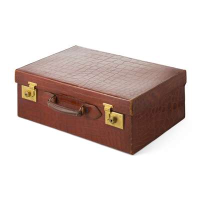 the interior fitted with ivory accessories and silver mounted bottles, with maker's stamp and hallmarked London 1924, with gilt brass locks, with original canvas cover with initials P. D. C.