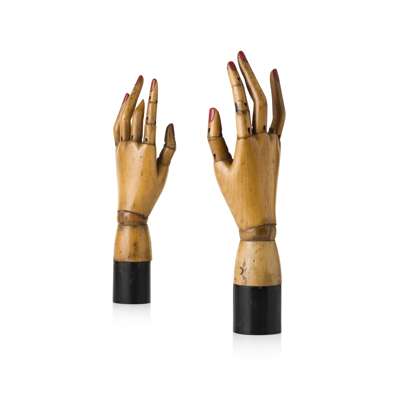 each with an articulated forefinger and thumb, on an ebonised base (2)