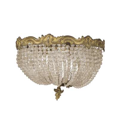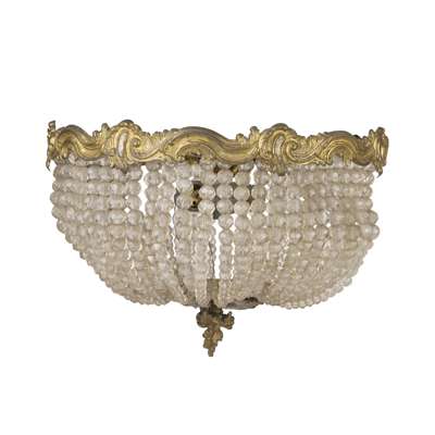 each with a rococo style gilt bronze ring hung with cut glass prisms swags, united by a foliate pendant finial (3)