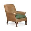 with a padded back and enclosed arms above a loose cushion seat, raised on cabriole legs with carved pad feet