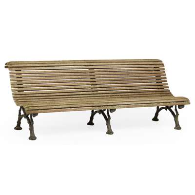 with three painted cast iron supports in the form of entwined tree branches, with a scrolling wood slat back and seat