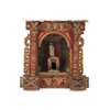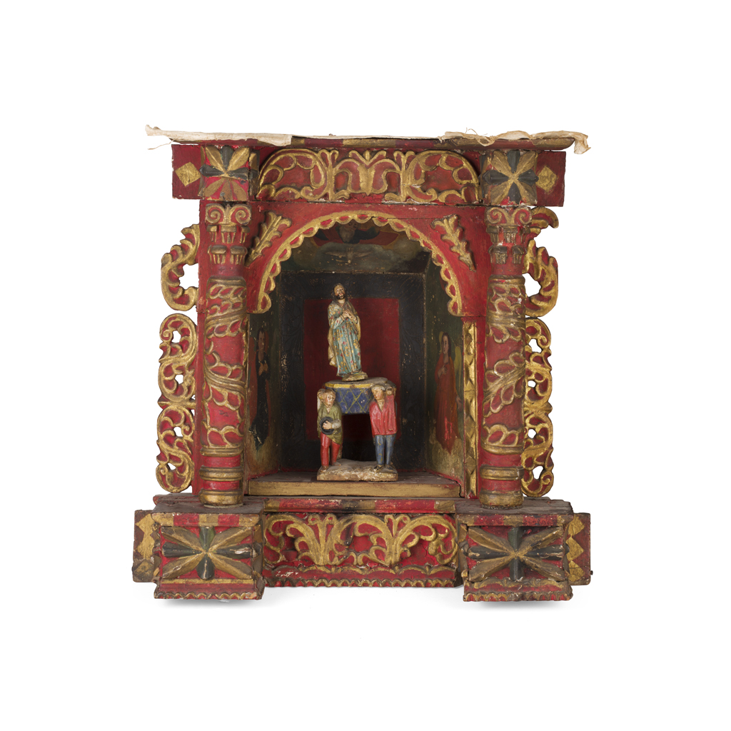 the carved breakfront architectural surround painted in red and gilt enclosing an arched recess painted with figures, with a carved figure of Christ on a dais with attendants
