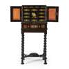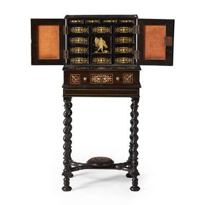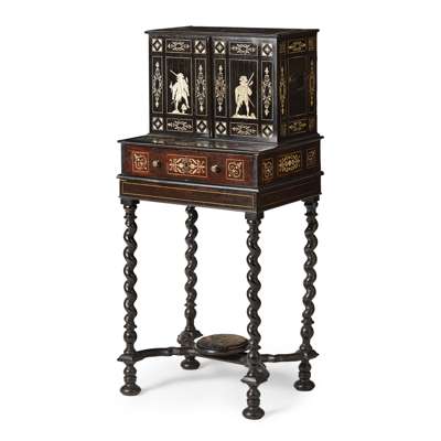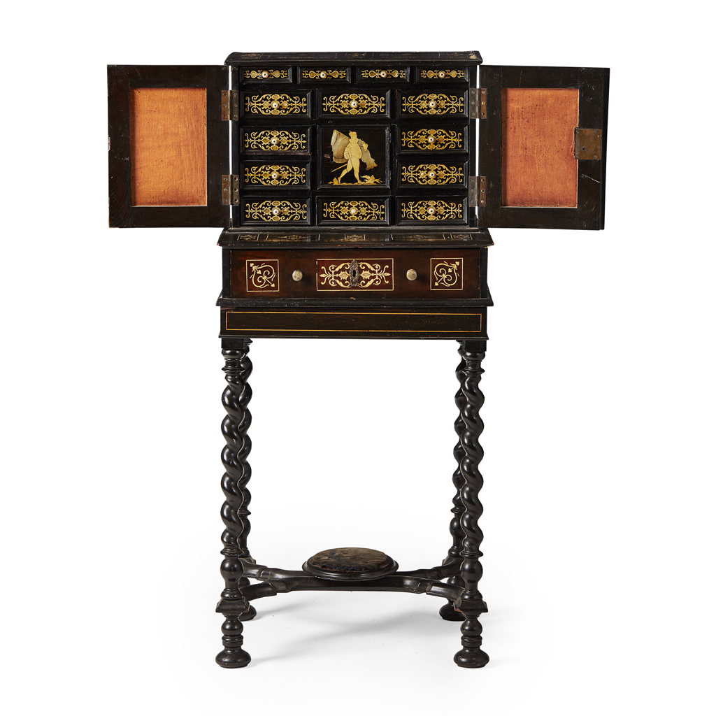 the upper part with a pair of doors with inlaid panels depicting cavaliers, opening to an interior with an arrangement of drawers around a central drawer with a further inlaid panel of a cavalier, above a projecting long drawer; the later stand with spiral carved legs joined by a shaped X-form stretcher raised on flattened bun feet