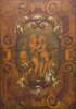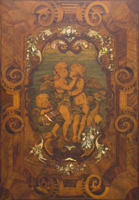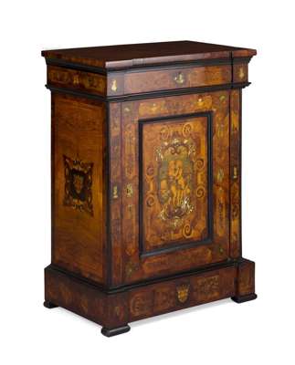 the rectangular top over a single frieze drawer and moulded panel door, inlaid with stained fruitwood, ivory, abalone and mother-of-pearl depicting putti, the outer panels with figural brass and conforming inlay, the interior with graduated drawers, on a plinth base