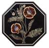 the octagonal black slate top inlaid with various hardstones depicting poppies, raised on an ebonised turned support with x-form base