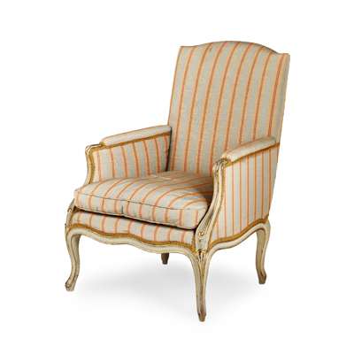 in the Louis XVI style, the arched padded back and enclosed arms above a loose cushion seat, over a grey painted seat rail and cabriole legs outlined in gilt, in pale blue and salmon pink striped upholstery