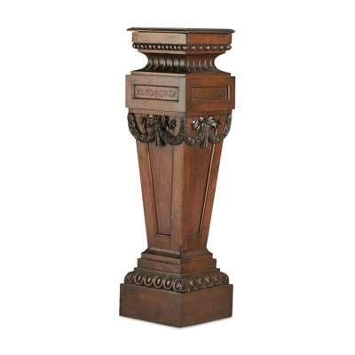 in the Louis XVI style, the moulded square top over a waisted and tapered square column carved with ribbon tied flower swags, on a gadrooned square plinth base