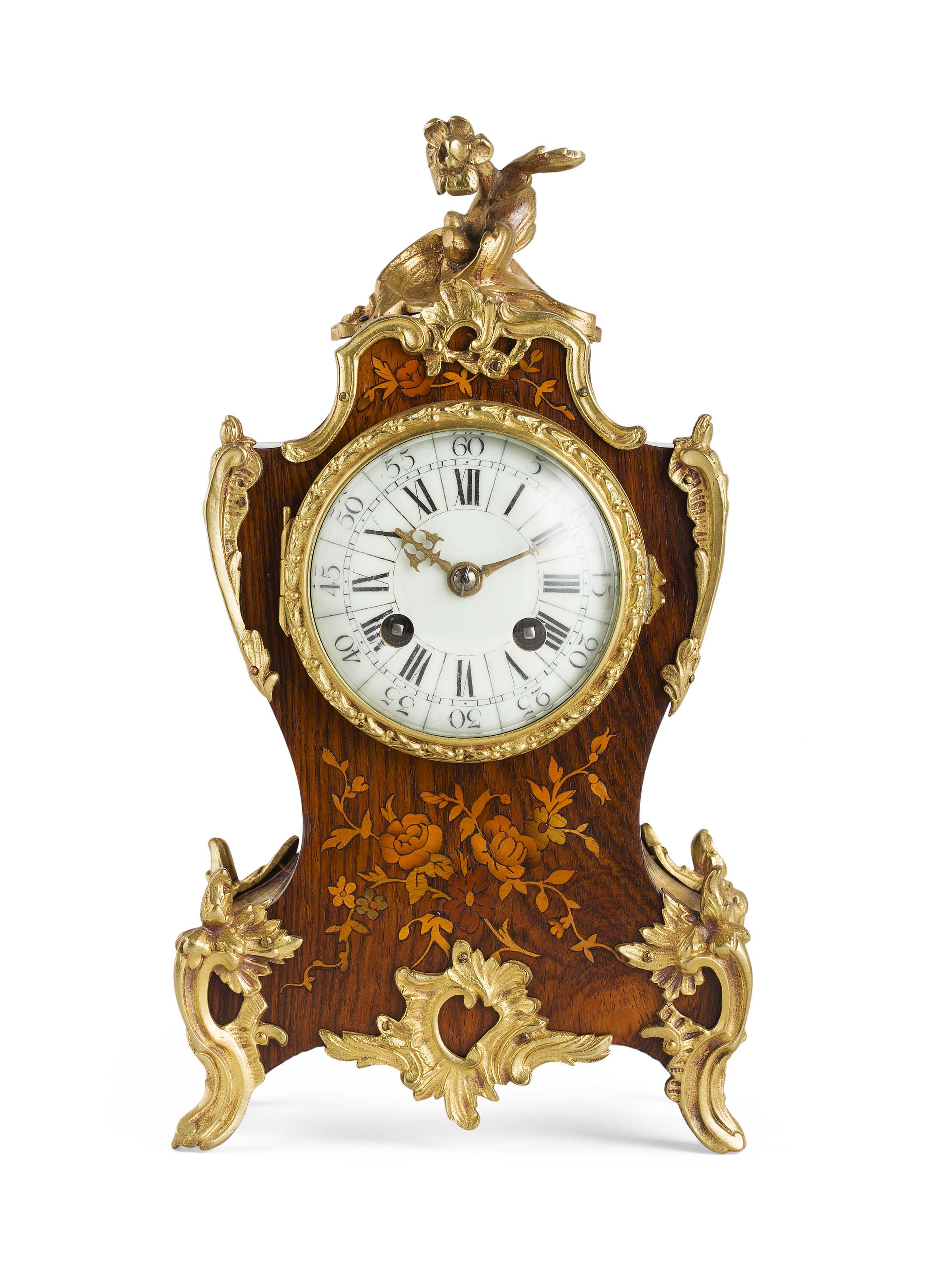 LOUIS XV STYLE ROSEWOOD AND MARQUETRY MANTEL CLOCK