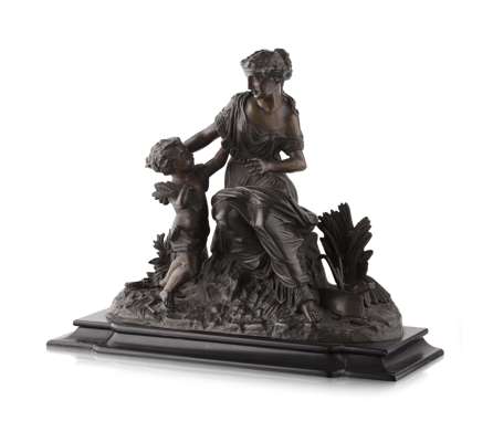 dark brown patina, modelled as a seated young woman and putto clasping wheat sheaves, on a naturalistic base and polished slate plinth