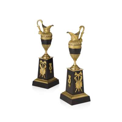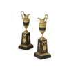 in the form of ewers, raised on a square tapered plinth with applied military trophies (2)