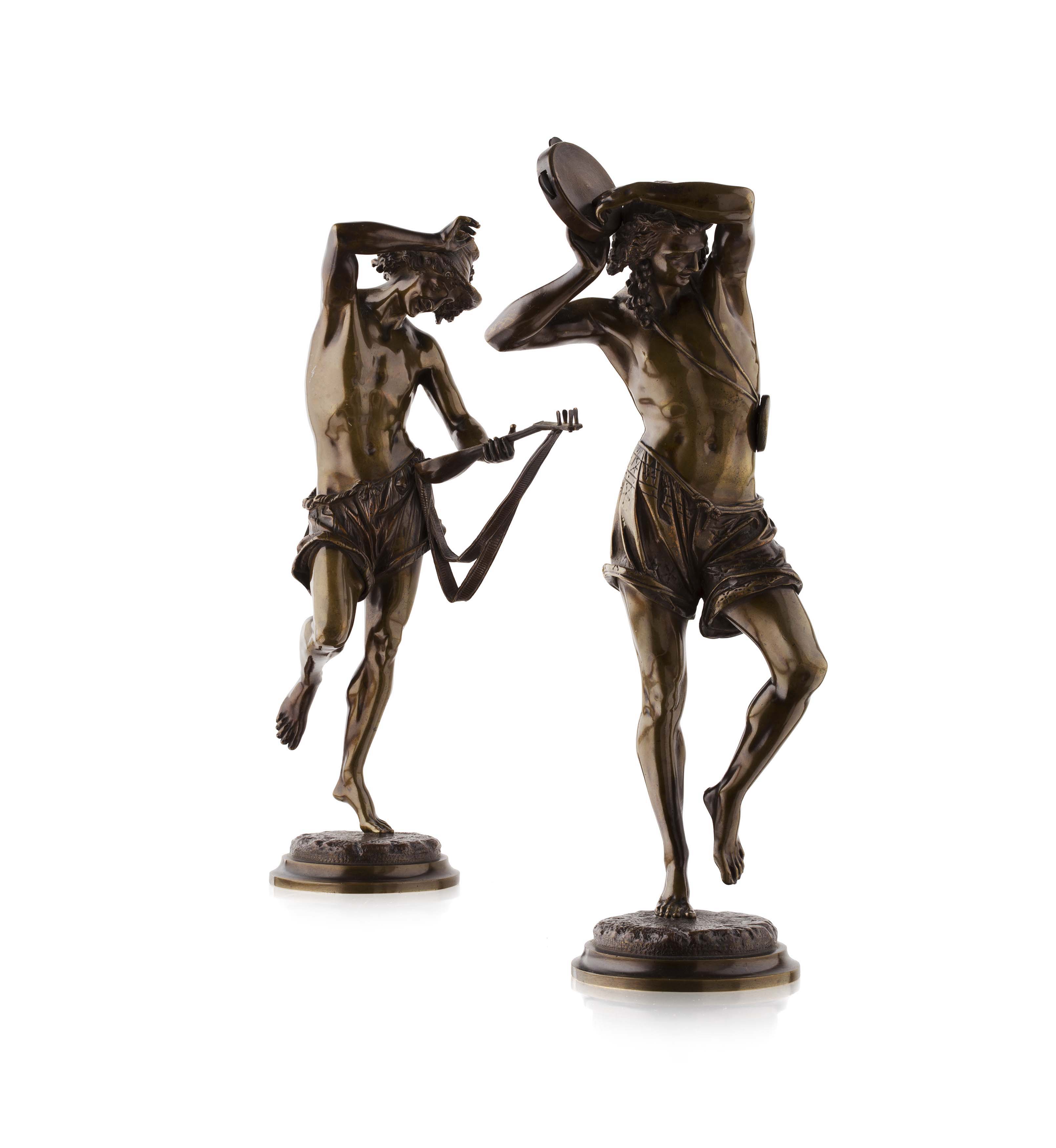 bronze, light brown/green patina, one figure with a tambourine, the other a lute, on signed circular bases, 'A.CARRIER' (2)
