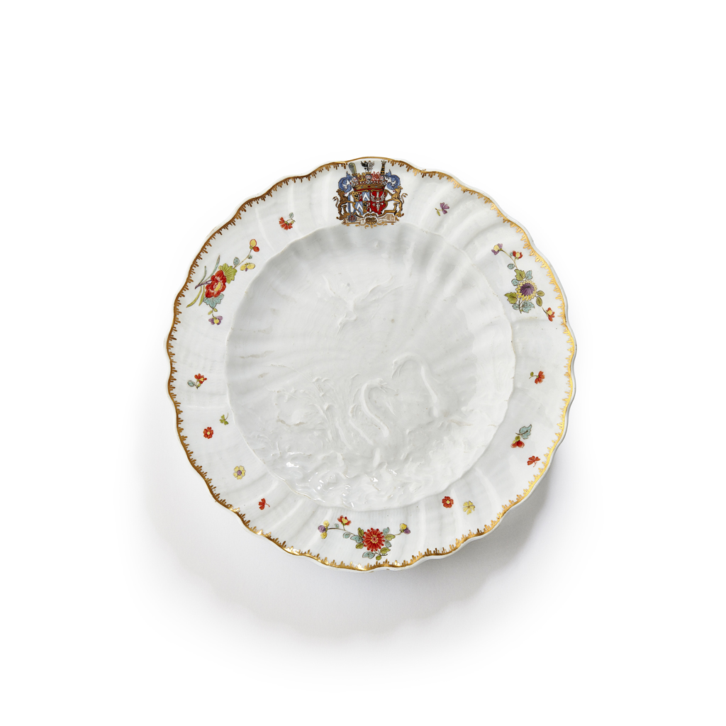 modelled by J.J. Kaendler and J.F. Eberlein, of lobed circular form with shell-like moulded rim border, decorated with a gilt rim and Indianische blumen flanking a central joint coat of arms for Count Bruhl and his wife, Maria Anna Franziska von Kolowrat-Krakowsky, enclosing a central moulded scene of two swans amongst bullrushes with a heron in flight overhead, with blue crossed swords marks