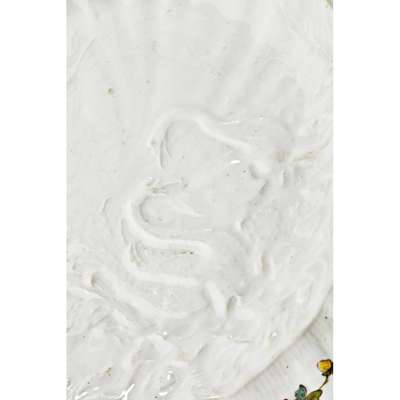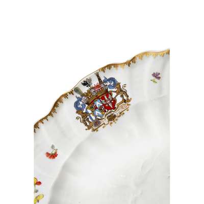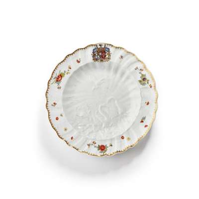 Designed and modelled primarily by J.J. Kändler with assistance by J.F. Eberlein, the service was a bold departure from the Japanese and Chinese styles so prevalent in the early years of Meissen's production. In preparation, Kändler spent three days drawing and studying shells in the Natural History cabinets in Dresden, incorporating his observations into the underlying shape of the plates. The overarching theme of the service may have been a play on Brühl's surname which means 'watery ground' and the shell motifs, aquatic birds and figures utilised are emblematic of this subject. Kändler was insistent that the enamel decoration be kept to a minimum allowing the moulded detail to be the focal point of the service, with only a scattering of Indianische blumen around the borders which are edged in gilt. The service bears the joint coat of arms of Bruhl and his new wife, Maria Anna Franziska von Kolowrat-Krakowsky but the crest intentionally does not dominate the design, being placed neatly on the rim so as not to obscure the relief moulded centres.