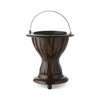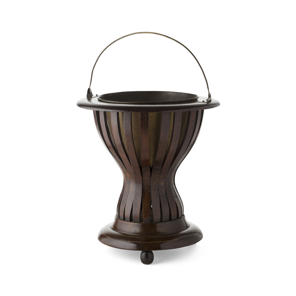with a brass swing handle and liner, of waisted form with open splats and a circular base, raised on three ball feet