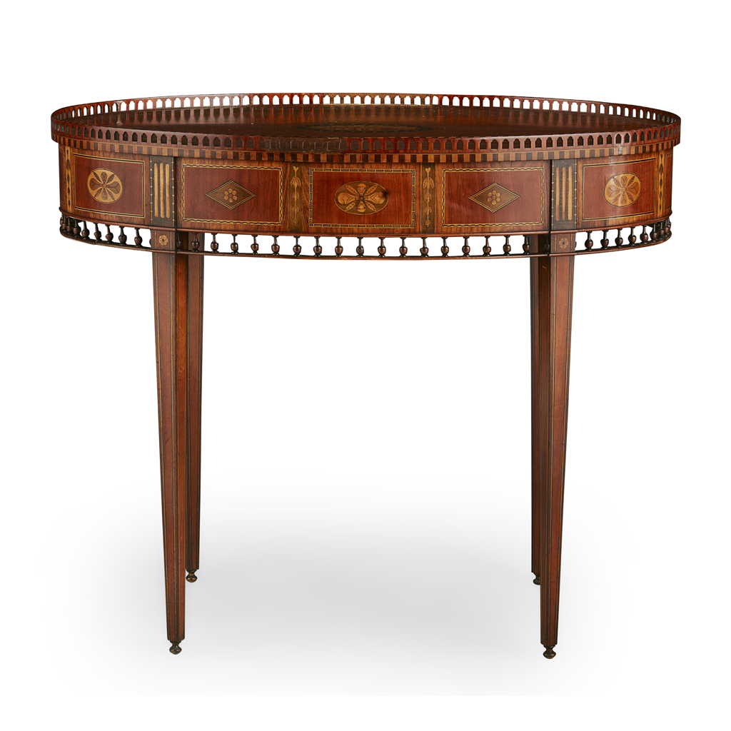 the oval top centred by a shell motif medallion within bands of geometric inlay, and a pierced gallery, above a frieze with inlaid with lozenge and oval flower motif inlay above a galleried apron, raised on square tapered legs