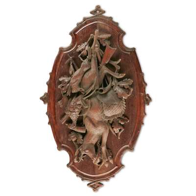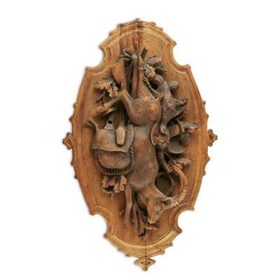 carved in high relief with a hare, chamois, ibex, game birds and various hunting and stalking implements, against shaped cartouche panels (2)