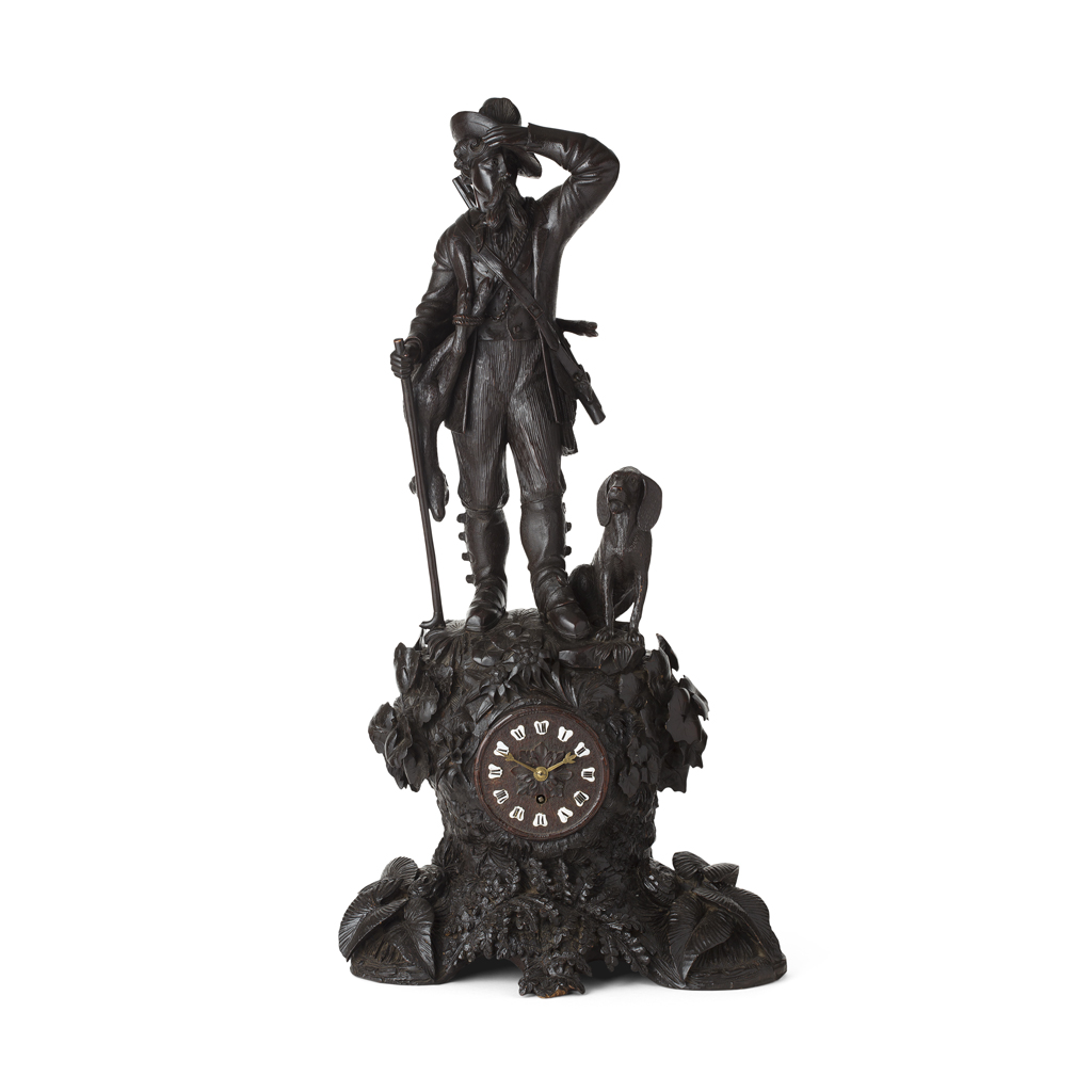 carved with a hunter and his dog, above the naturalistic base with foliage in high relief, the dial with white enamelled chapters and Roman numerals, the movement stamped G J