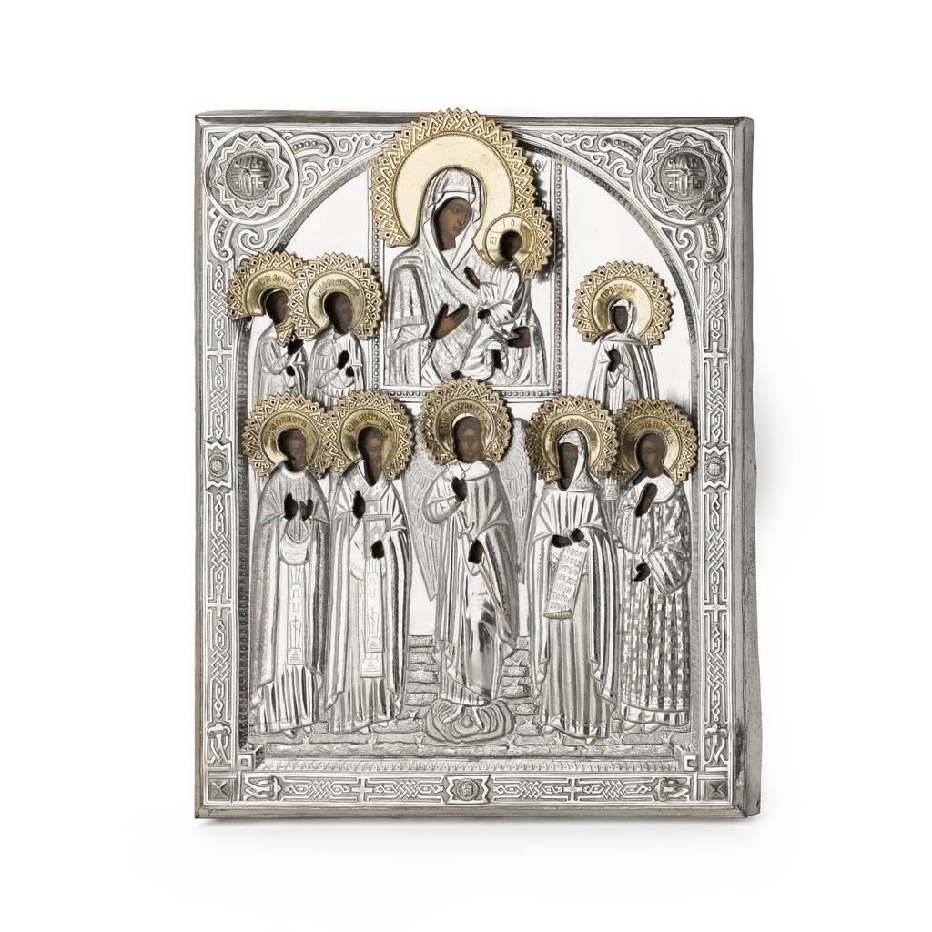 with an unmarked repousse white metal and gilt oklad with attached haloes, the central Madonna flanked by three saints above a row with an archangel flanked by four further saints