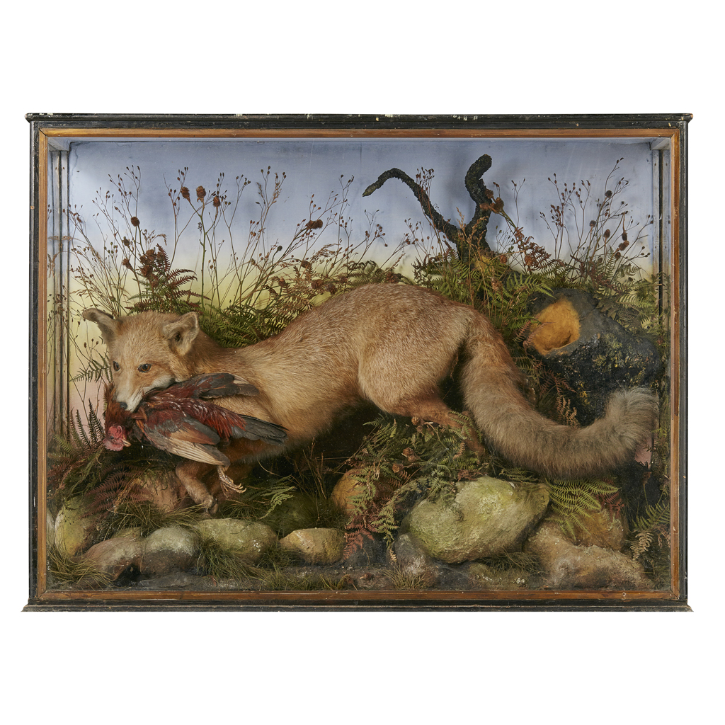 VICTORIAN CASED TAXIDERMY FOX AND HEN DIORAMA