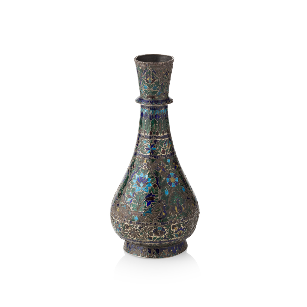 of baluster form, enamelled all over in blue and green enamels with flowers, foliage and birds