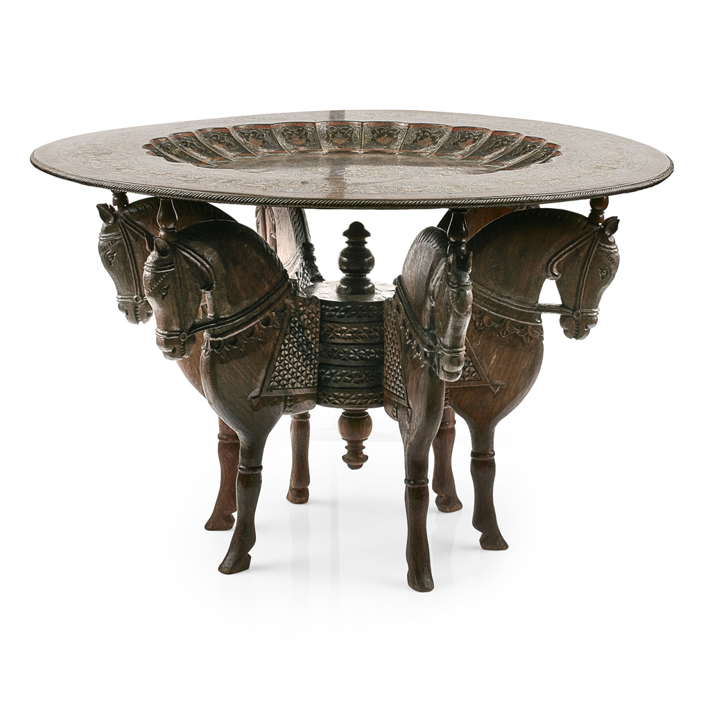 of circular form with a large flat rim and lobed central reserve, engraved all over with floral motifs with enamelled detail, raised on a folding stand carved with six horse's heads (2)
