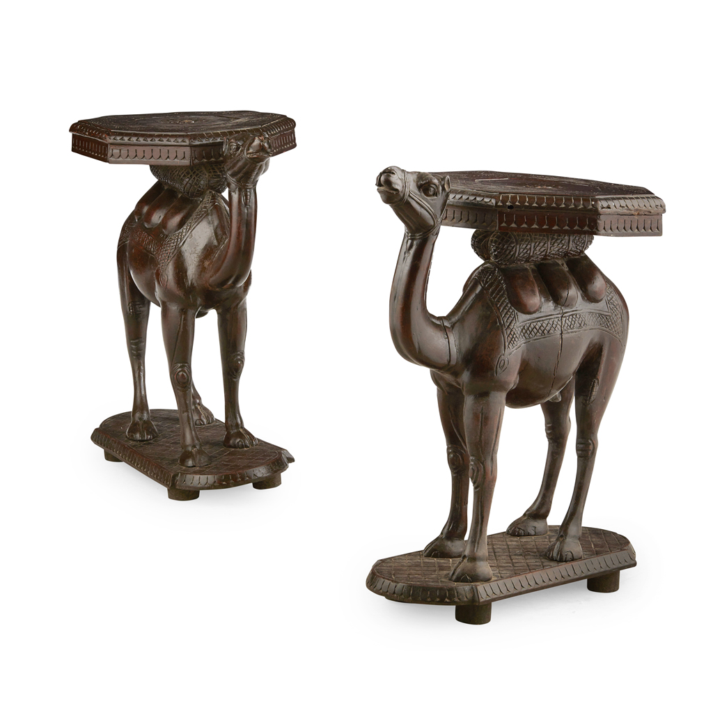 in the form of camels with chip carved octagonal tops, mounted on shaped oval bases (2)