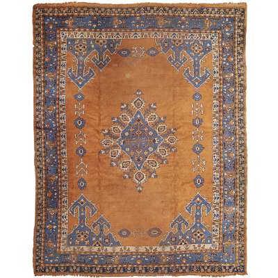the plain tan brown field with blue lozenge medallion, arrowhead spandrels, within blue boteh and vine border