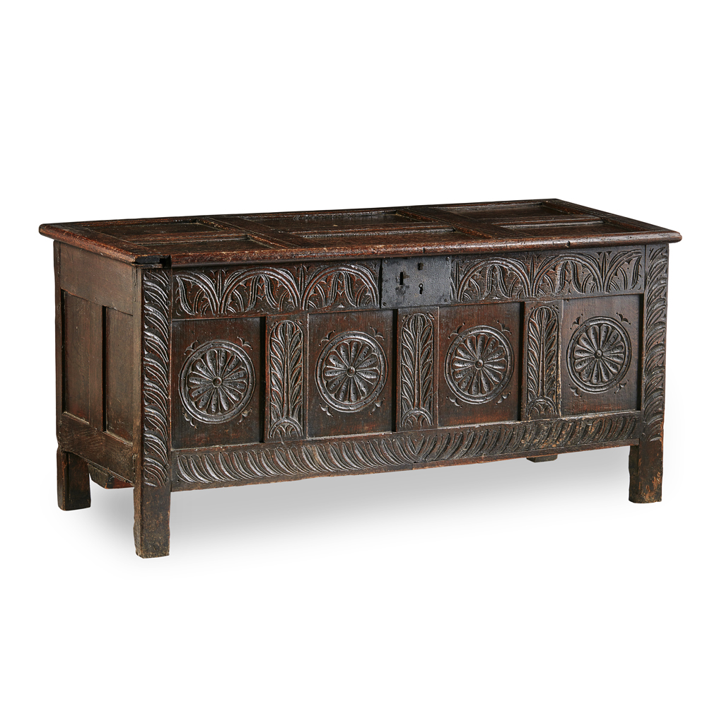 the six panel hinged top above a four panel front carved with stylised flower and leaf motifs, raised on stile feet
