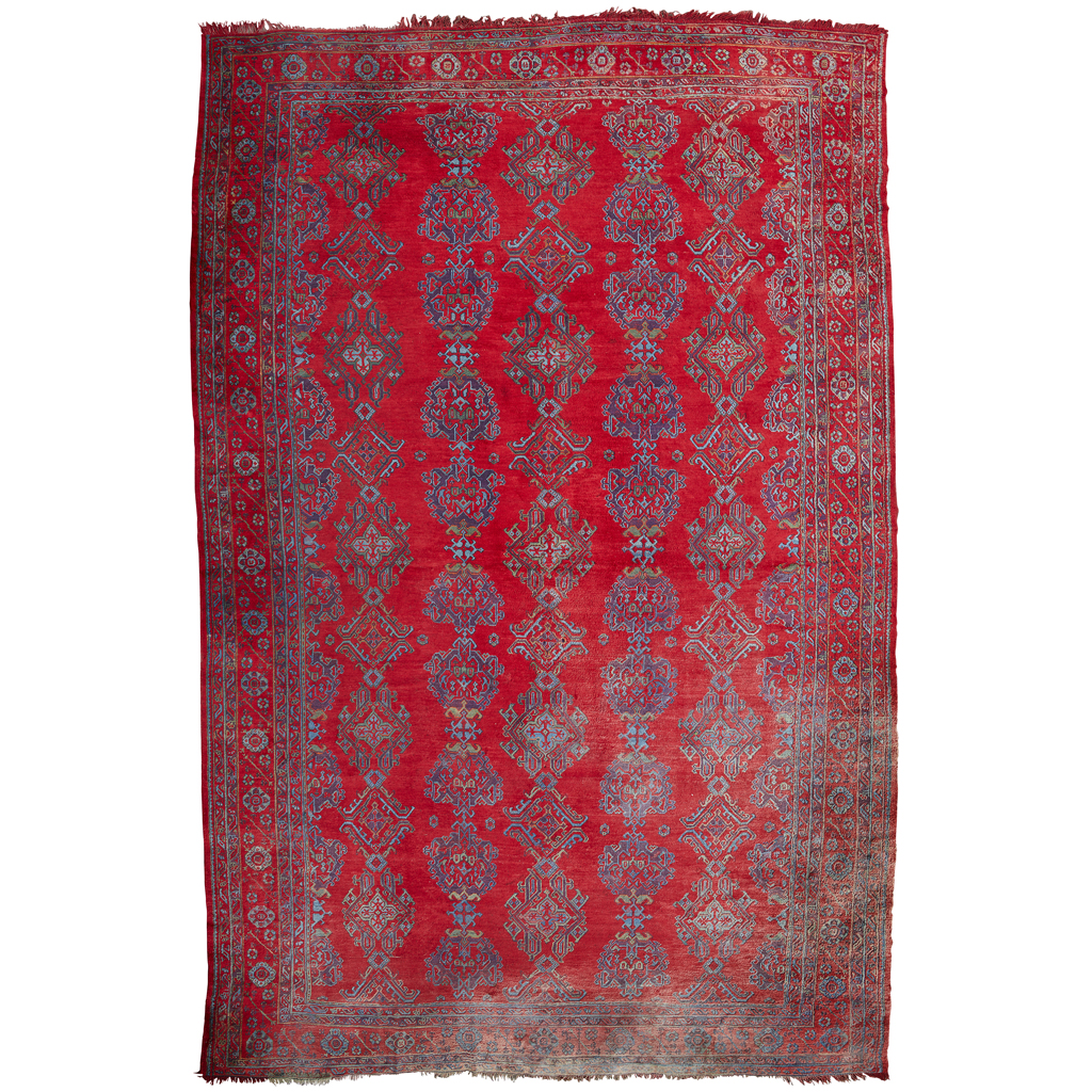 the red field with columns of indigo palmettes and cruciform motifs, within red rosette and branch border