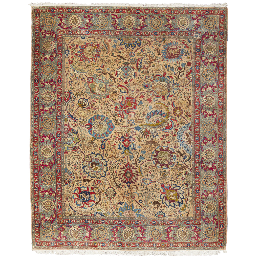 the light brown field with palmettes, animals, trees and other foliate motifs, within turquoise palmette and vine border, signature star to one corner