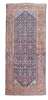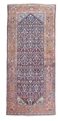 the indigo field with allover herati pattern, ivory spandrels, within brick red turtle palmette and vine border between bands