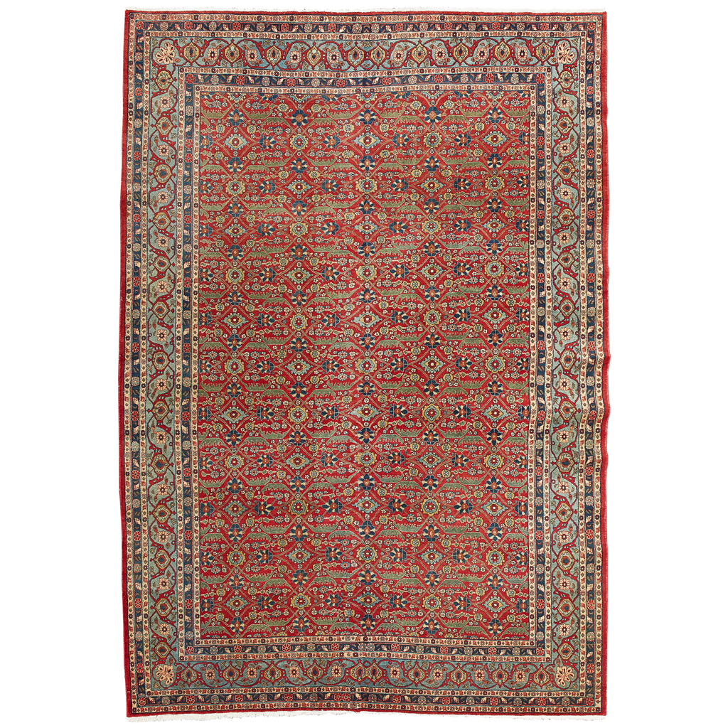the red field with allover stylised foliate lattice pattern, within light blue turtle palmette and vine border