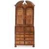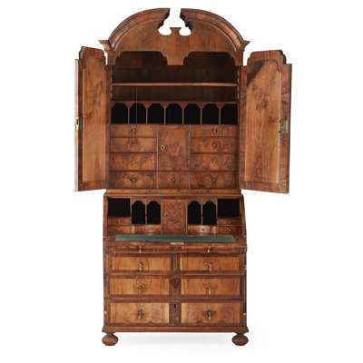 the broken arch moulded pediment above a pair of moulded shaped panel doors opening to an interior fitted with shelves, small drawers; the lower part with a slant front opening to pigeon holes, drawers and a baize line writing surface, over a long drawer, a pair of short drawers and two further long drawers, raised on bun feet