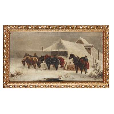 A PAIR OF PAINTINGS - HORSES IN SNOW