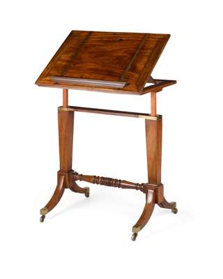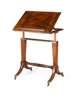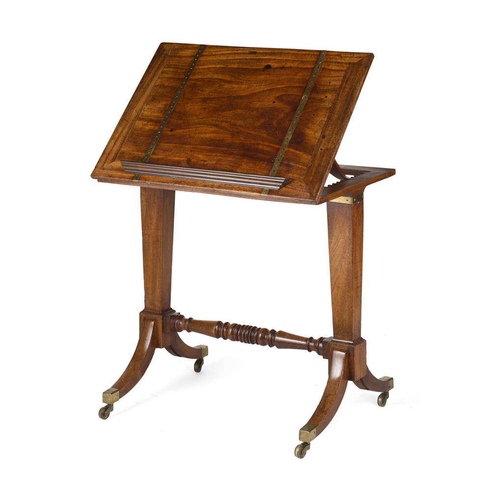 the rising hinged rectangular top with a ratchet adjustment and moulded bookrest, raised on tapered square supports joined by a turned stretcher and ending on short sabre legs ending in brass caps and castors