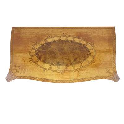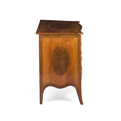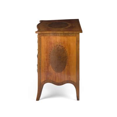 the serpentine and crossbanded top centred by an oval reserve inlaid with twining vines and ribbon, over three long graduated drawers centred by graduated oval reserves encircled with palm frond inlay, with further bellflower garlands hanging from the banded inlay and wrapping around the later handles, the serpentine sides with further ribbon tied oval reserves, raised on splay legs