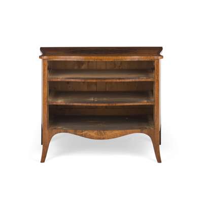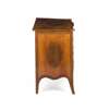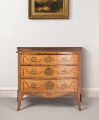 This elegant serpentine commode, with its playful garlands of bellflowers that encircle the handles, its sinuous ribbon and palm inlay, and its well-chosen use of exotic and contrasting veneers, achieves a harmonious and pleasing effect, and is a testament to the finest cabinet-makers working at the last part of the 18th century.