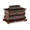 with a pagoda form hinged top above an ogee moulded body, opening to reveal two lidded compartments, raised on squat bun feet