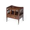 the four division top with slat spindle sides, over a long base drawer, raised on turned and tapered legs ending in brass caps and castors