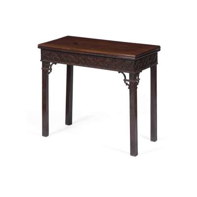 the foldover rectangular top with a moulded edge, over a blind fret carved frieze, raised on square straight legs with pierced and carved corner brackets