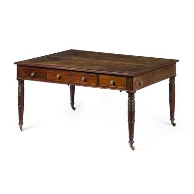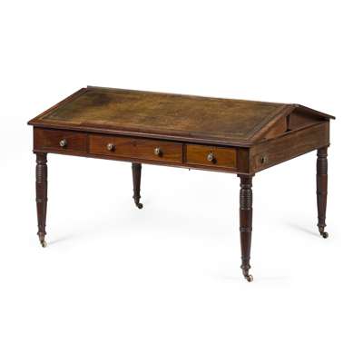 the hinged and divided top with brown leather writing inserts, each ratchet adjustable half with a removable book support rail, over three frieze drawers with the same opposing, the sides with small drawers, raised on part ring-turned tapered legs ending in brass caps and offset castors