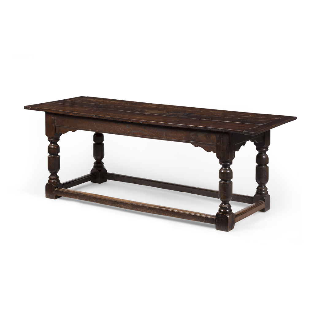 the cleated triple board top above a plain frieze, raised on cup and cover carved baluster legs joined by a peripheral stretcher