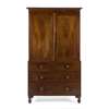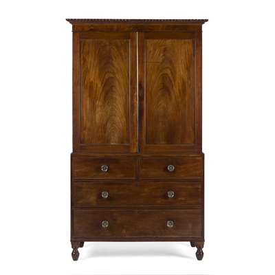 the gadrooned cornice above a pair of moulded panel doors open to four sliding trays; the lower part with two short over two long drawers, raised on turned feet