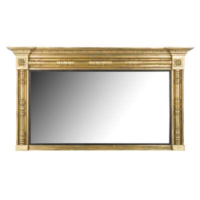the inverted leaf moulded breakfront cornice above a rectangular mirror plate in an ebonised slip and framed by ring turned spindles