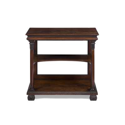 the rectangular top above a bead and cushion moulded frieze, supported on columns with palmette carved capitals and joined by a concave undertier, on a rectangular base with bead moulding and raised on bun feet