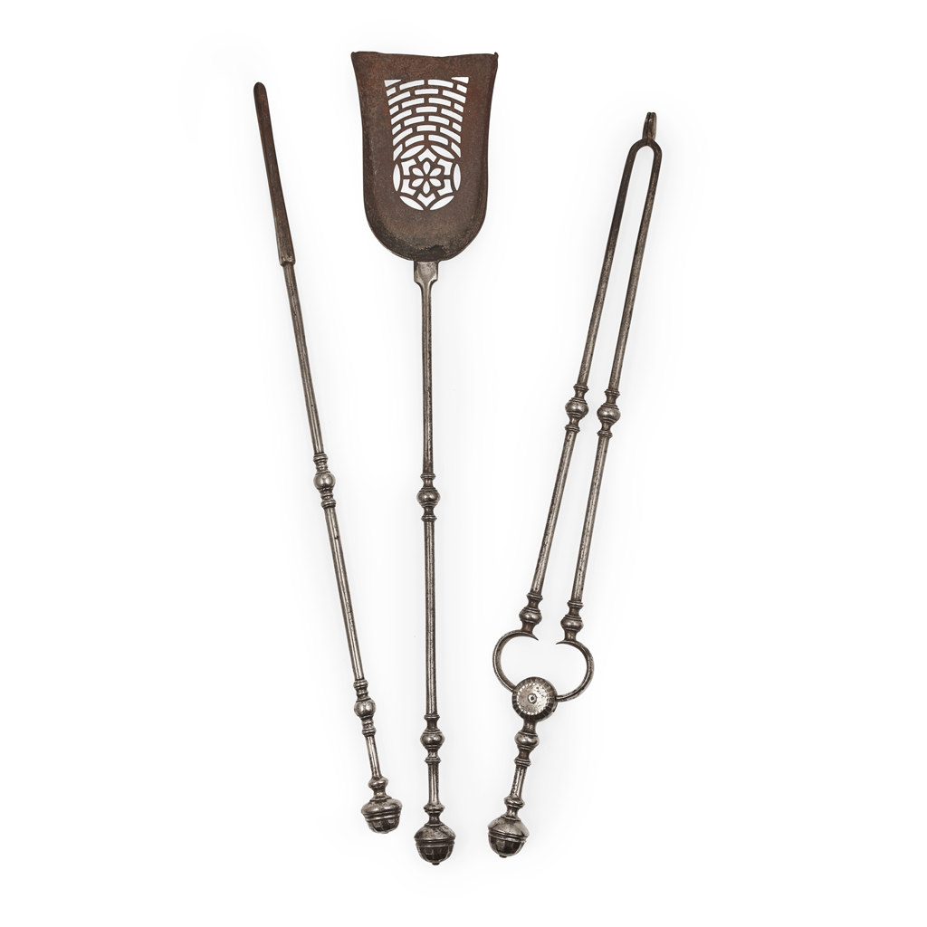 each with a knop finial and stem, comprising a shovel, 79cm long; a pair of tongs, 73.5cm long; and a poker, 75cm long (3)